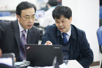 南方泵業總裁沈鳳祥先生與陳羽天老師溝通授課及課件設置
