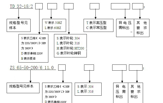 為明確標(biāo)注泵的各種配置要求,在型號后用字母區(qū)分(最后兩位空格內(nèi)容在水泵銘牌及合格證上不注),其字母含義說明如下: